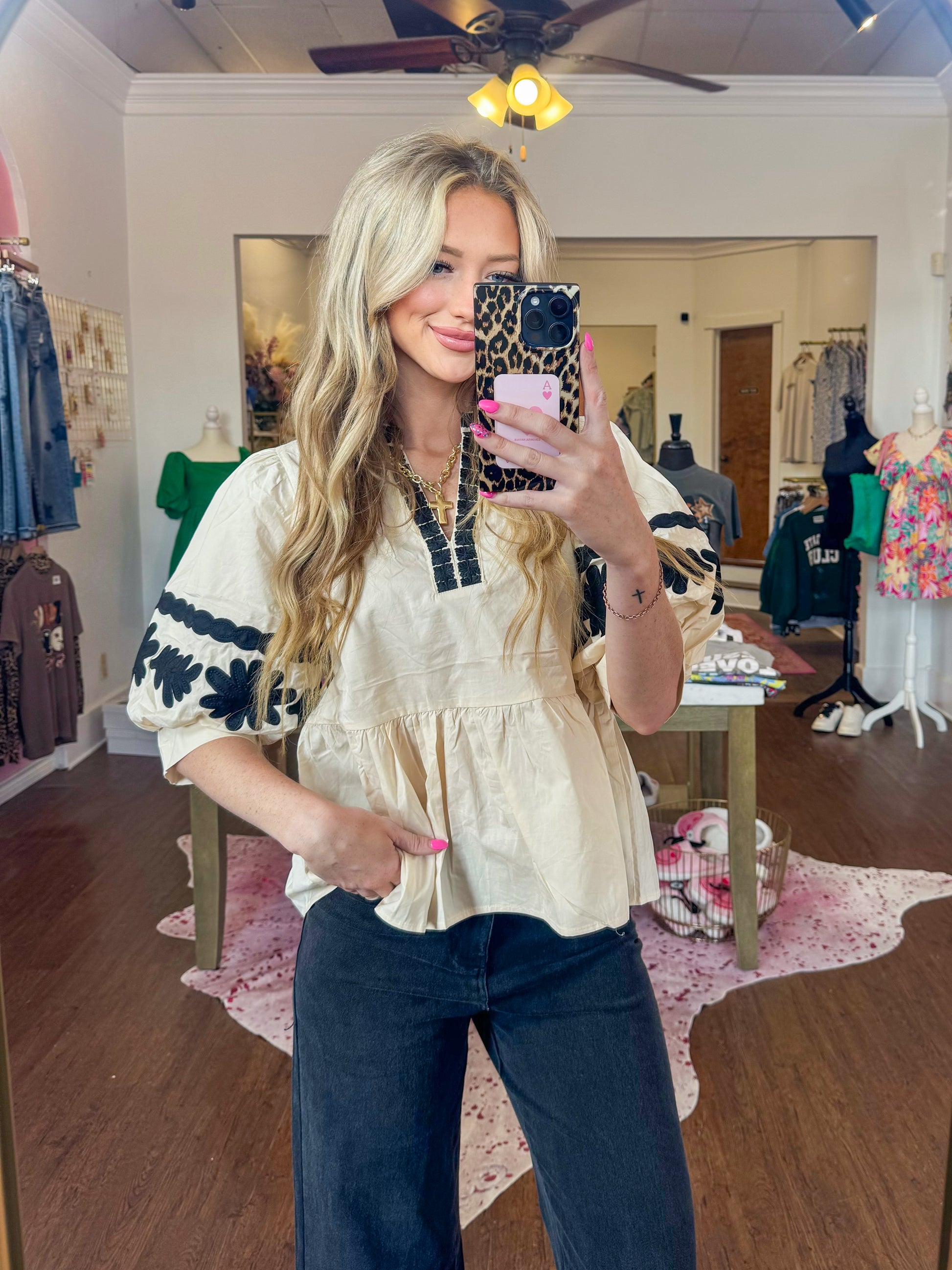 Cream Blouse with Puff Sleeves and Black Embroidered Detail