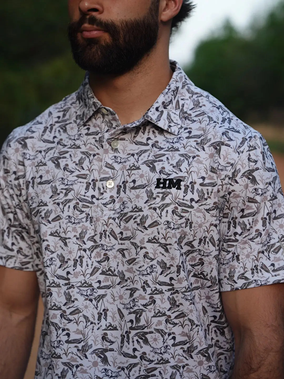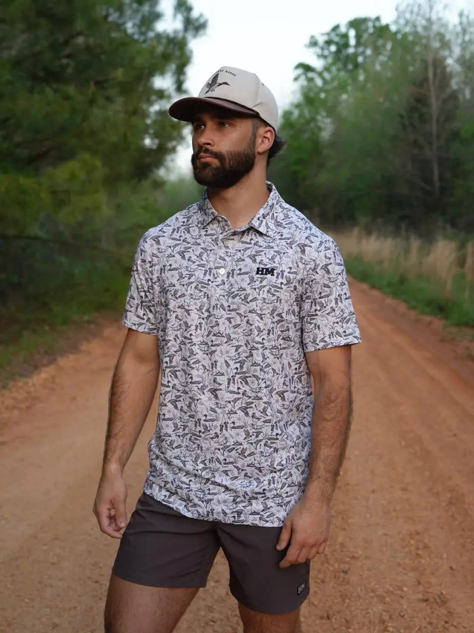 The Duck Club performance polo is a wardrobe essential for any duck hunter. When it's time to hang up the camo for a more classic look, this performance polo has your back. This classic design features all the things that cross a duck hunter's mind from duck calls, a labrador retriever, decoys, pintails, wood ducks, mallards, and more. With its four-way stretch, UPF technology, moisture-wicking capabilities, & anti-microbial features, this polo is ready for any adventure or even a casual night out.